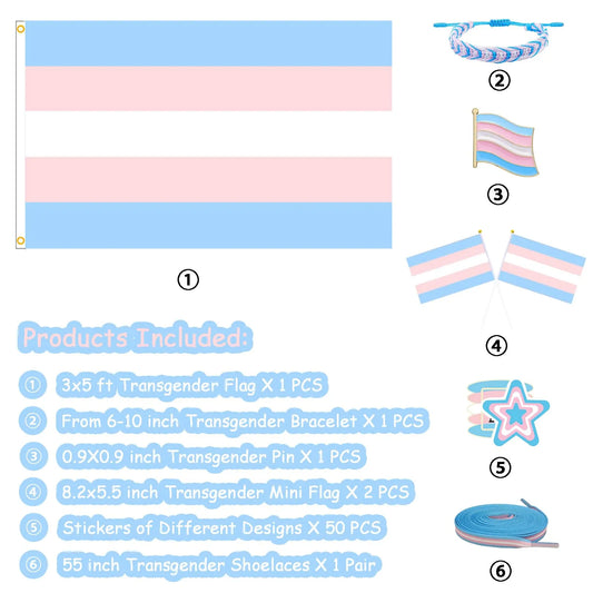 Great Value Bundle | Trans Pride | Includes: Flag, Bracelet, 50 Stickers, Pin, 2 Hand Flags, Shoelaces